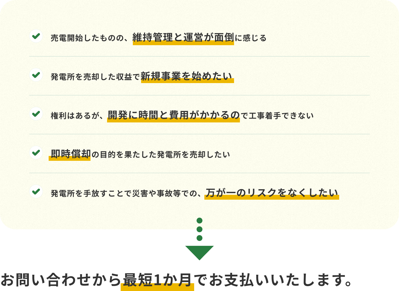 環境エネルギー事業者として日本各地の発電所の開発/取得実績により、より早く、より高い金額で買い取りいたします。