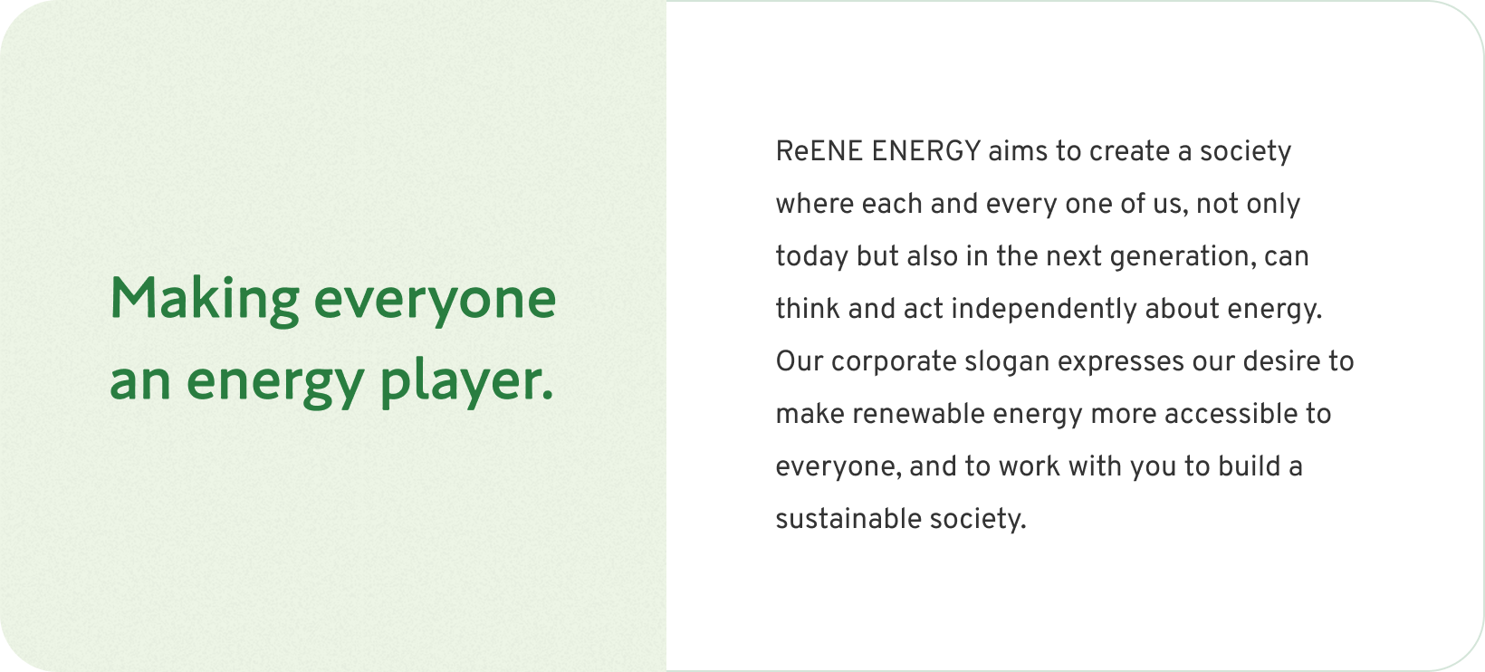 ReENE ENERGY’s logo is designed in the shape of an arrow to symbolize the energy generated through collaboration with local communitiies, joint business partners, and investors as we build our business together. The green represents Tokyu Fudosan Holdings Group’s brand color, the deep green signifies the earth, and the yellow expresses energy.